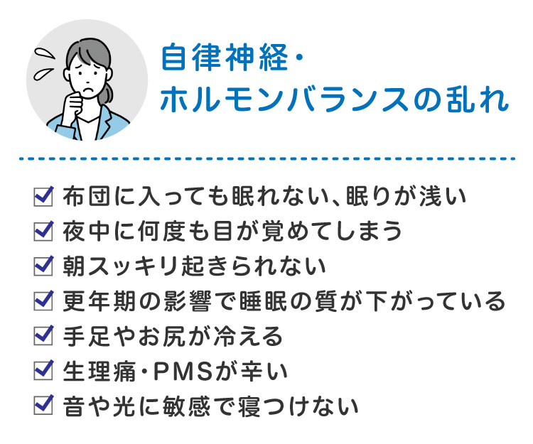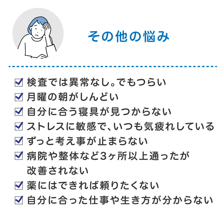 現代はストレスも多く、情報も複雑。 自律神経やメンタル、住環境、生活習慣、食事や体のゆがみなど、 不眠の原因はあらゆる要素が絡み合っています。