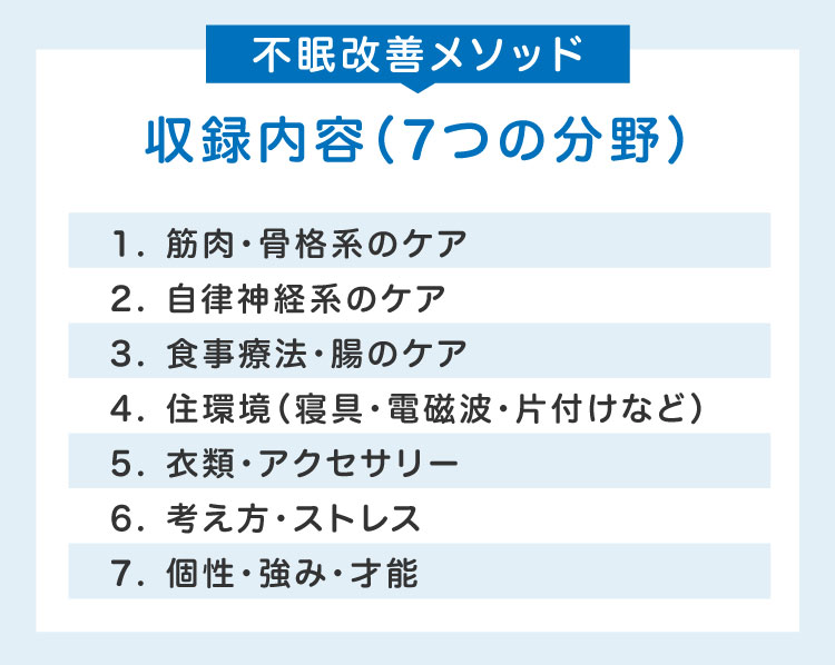 不眠改善メソッドの収録内容は、これらの7つの分野に分かれており、 各セクションは15〜20分程度で構成されています。