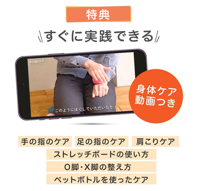 ご購入いただいた方には、特典として、 自分でできる身体のケア方法をまとめた動画もプレゼントいたします。